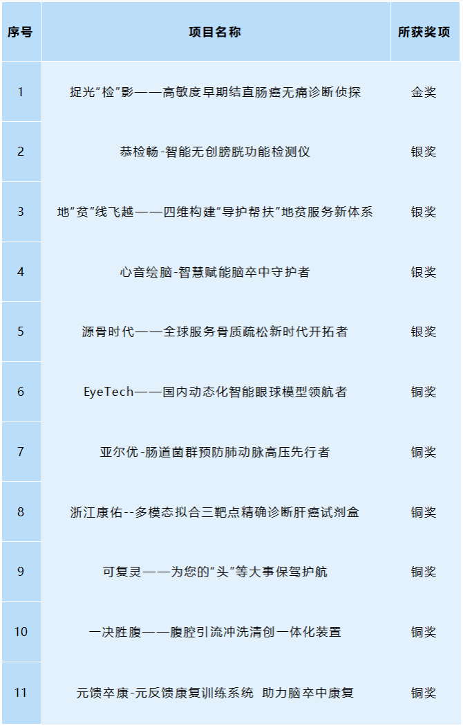 本届比赛分为科技创新和未来产业、乡村振兴和农业农村现代化、社会治理和公共服务、生态环保和可持续发展以及文化创意和区域合作五个组别,共有1936件作品进入省级复赛,69所学校的389件作品入围省级决赛。经过激烈角逐,小黄书 “捉光“检”影—高敏度早期结直肠癌无痛诊断侦探”项目获金奖。