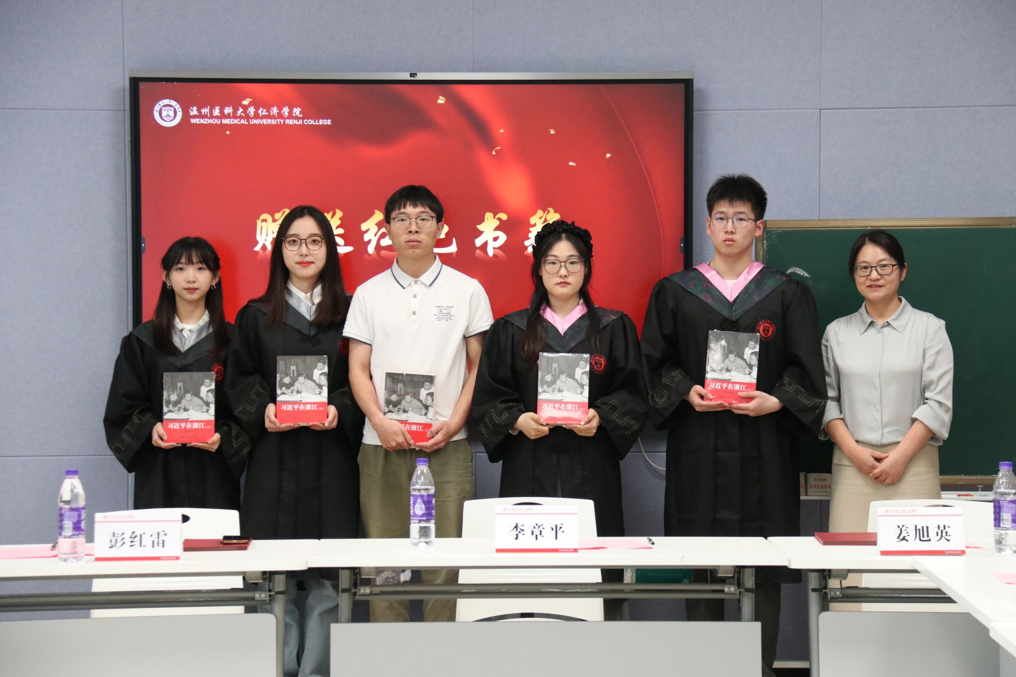 姜旭英代表学院向参会的毕业生代表赠送书籍,鼓励大家要做有理想、有本领、有担当的新时代青年。