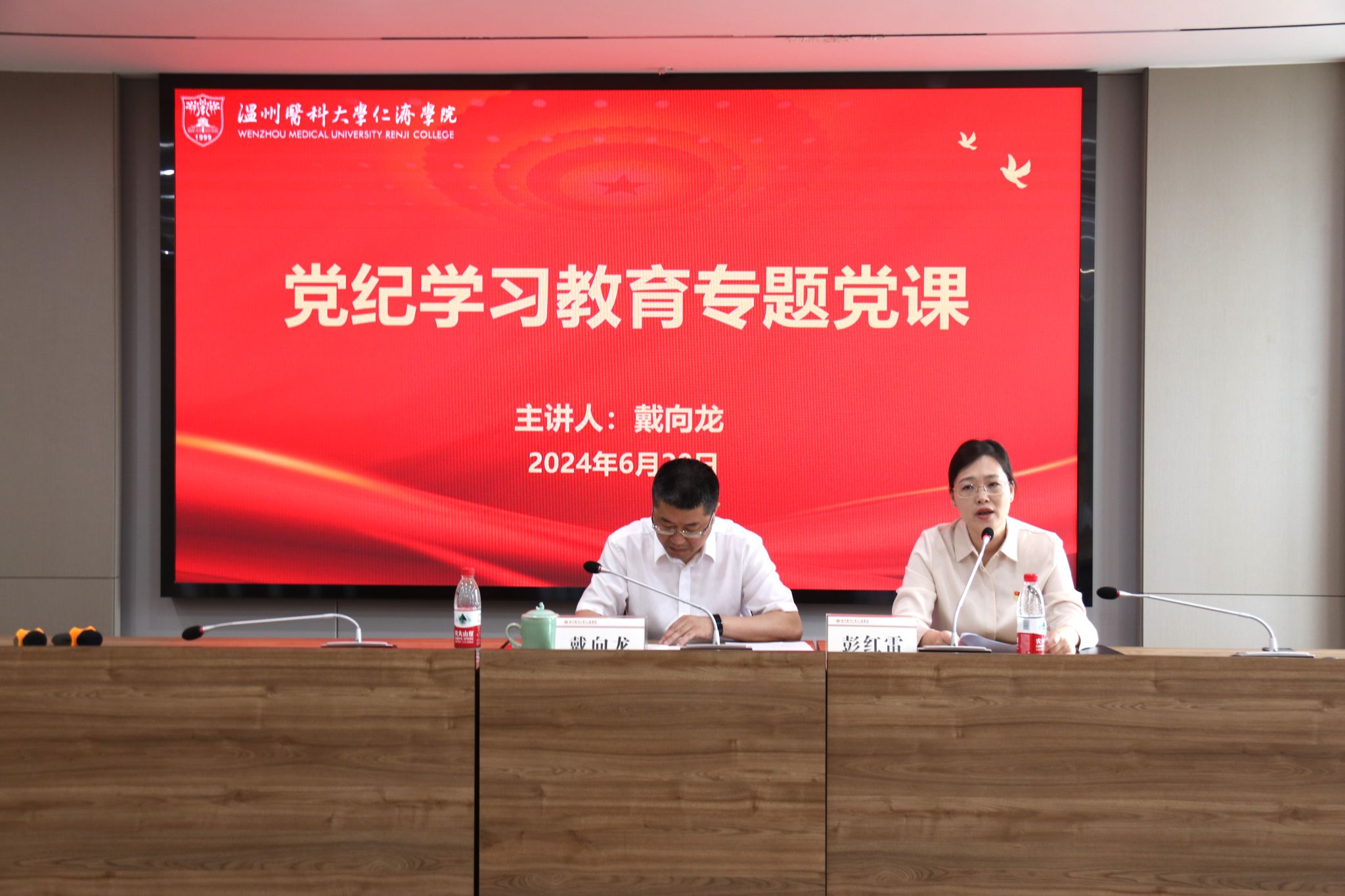 6月20日上午,学院在茶山校区同心楼六楼会议室开展党纪学习教育专题党课。校纪委副书记、纪检监察室主任戴向龙作《中国共产党纪律处分条例》专题辅导。会议由学院党委书记彭红雷主持,学院领导班子、科级干部、教职工党员参加。