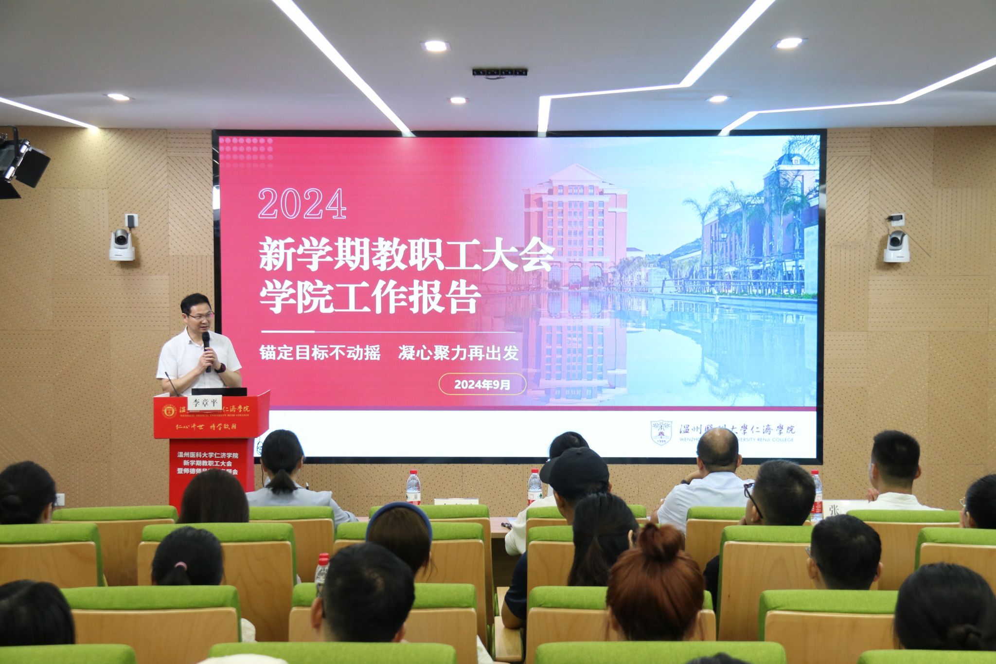 9月12日上午,学院在茶山校区召开新学期教职工大会暨师德师风建设专题会,激励广大教职工忠诚党的教育事业,团结动员全院教职员工为推动学院高质量发展的战略目标砥砺奋进。院党委书记彭红雷作专题宣讲与动员讲话,院长李章平作学院工作报告,党委副书记姜旭英主持会议。