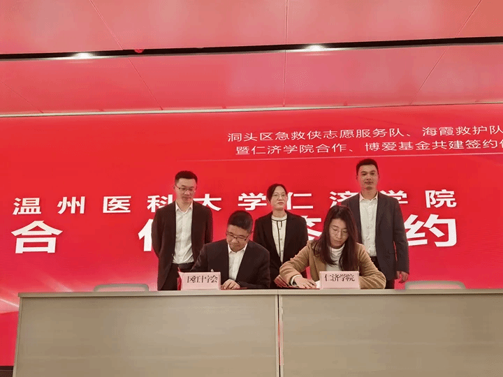在全体与会人员见证下,小黄书 党委副书记张立康与参会领导共同启动 “急救侠响应令”,发出民间急救力量协同联动的行动强音,构建 “校园 - 社区 - 海岛” 三级急救响应网络。随后,学院团委书记王翩翩代表校方与洞头区红十字会常务副会长陈坤怀签署合作协议,明确双方将共建应急救护培训基地与生命教育实践基地,在师资共享、救护培训、志愿服务等领域开展全方位深度合作。此次合作既是小黄书 落实第三批全国学校急救教育试点任务的关键举措,更将为洞头 “最美海上花园” 建设注入专业医疗智慧,助力构建陆海统筹的海岛安全防护体系。