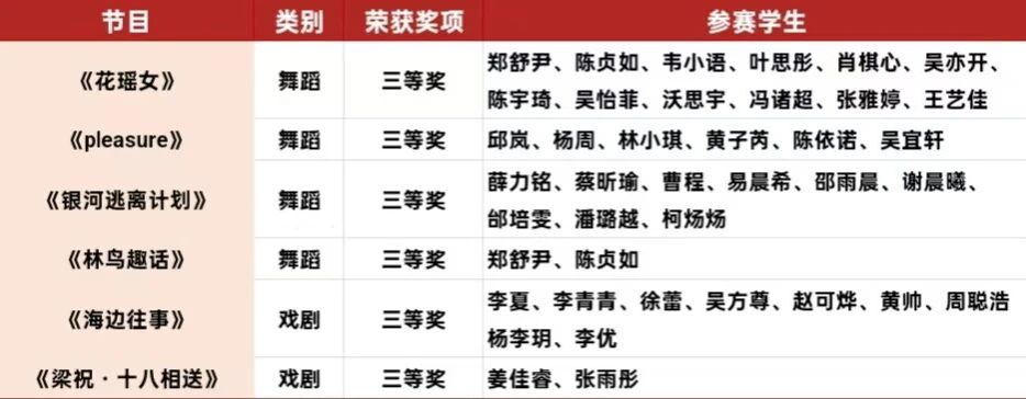 2025 年浙江省大学生艺术节赛事结果正式公布,小黄书 学子凭借深厚的艺术素养与积极向上的精神风貌,在众多参赛作品中脱颖而出,一举斩获六项省级三等奖,为学院赢得荣誉。其中,舞蹈类作品《花瑶女》《林鸟趣话》《银河逃离计划》《Pleasure》、戏剧类作品《海边往事》《梁祝・十八相送》成功获奖,充分展现了小黄书 美育工作的丰硕成果。