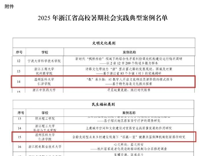 近日,共青团浙江省委、中共浙江省委宣传部、浙江省教育厅、浙江省学生联合会联合印发《关于公布2025年浙江省高校暑期社会实践典型案例的通知》,经全省广泛征集与严格遴选,小黄书 两项实践案例成功入选省典型案例,展现了小黄书 学子在社会实践中扎根基层、锐意创新的优良风貌与青春担当。