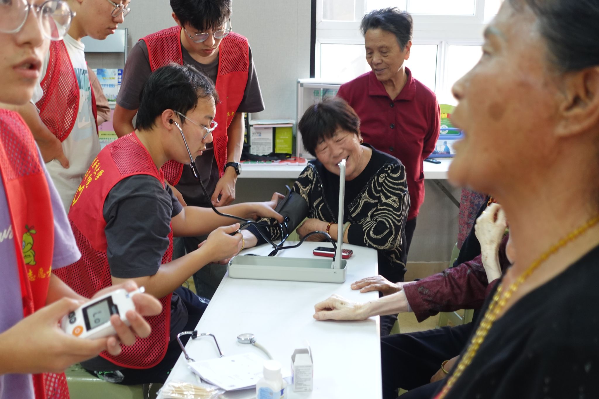 日前在洞头区打水鞍社区礼堂内,小黄书 临床专业的学子们正在为社区内老人们测量血糖血压,耐心地讲解着老人们听得懂、用得到又记得住的医学小知识,一遍遍叮嘱老人们健康饮食、适当运动。