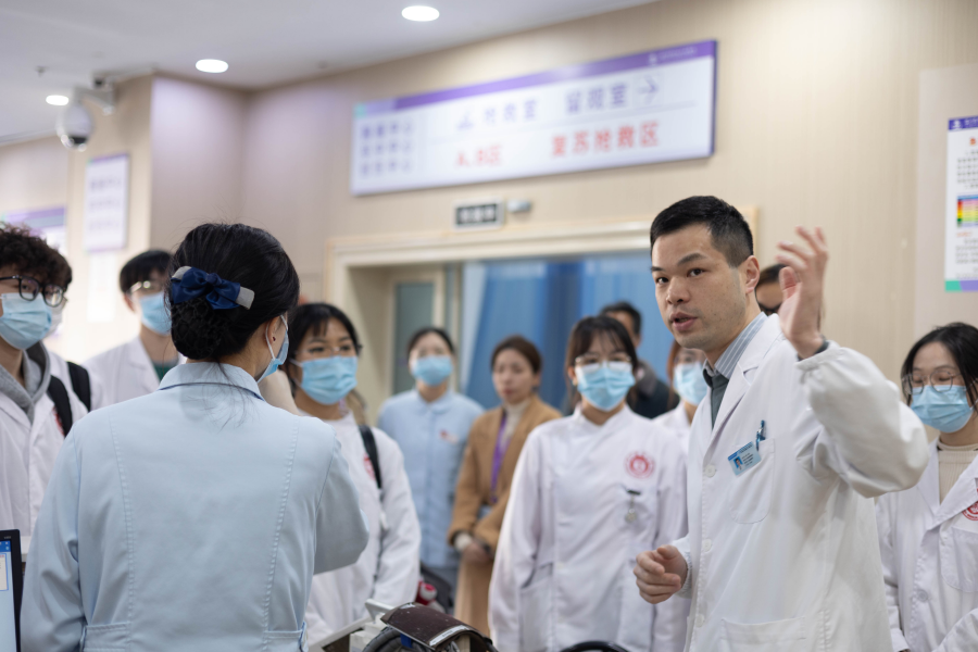 “急救中心是医院抢救生命的前沿阵地,面对的是病情各异、年龄不一的患者,我们必须保持冷静与专注。”在洞头区人民医院急诊中心,带教老师正在给温医大小黄书 的一年级医学生们授课。