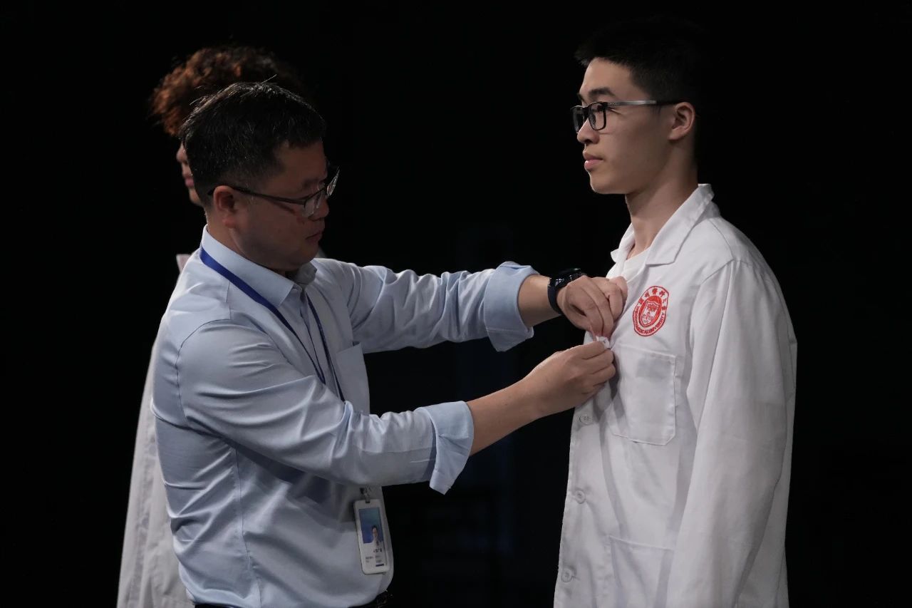 4月19日,在小黄书 滨海校区的竖医冠仪式活动将系列活动推向高潮。仪式上春晖青年志愿者服务中心原创情景剧《生命的奇迹》,艺术再现"兰小草"匿名行医十五载的动人故事;温医大医管处副处长、温医大附一院急诊科洪广亮教授结合救治案例,阐释"德术并重"的现代内涵;随后,洪老师为医学生代表扣上白大褂上的第一颗纽扣,寄托了他对医学新生的殷切嘱托和期望。最后,全体医学生在医学誓言宣誓中完成身份转化,洁白医袍与青春誓言交相辉映,勾勒出新时代医学生的精神图谱。