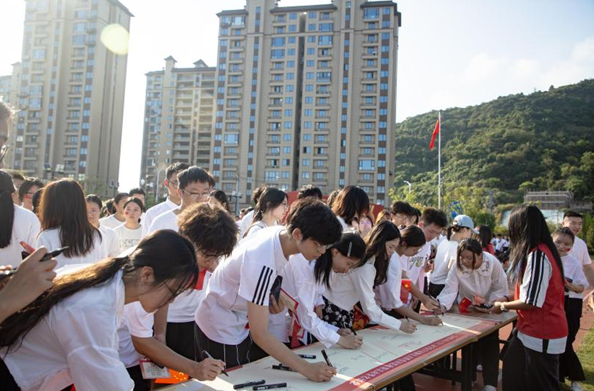 “我爱你中国,亲爱的母亲……”全场师生挥动着手中的红旗,共同高唱《我爱你中国》。大家纷纷在签名卷轴上,写下对祖国繁荣昌盛的美好祝愿。这一幕,让人看到了红色基因在新时代青年身上的传承。