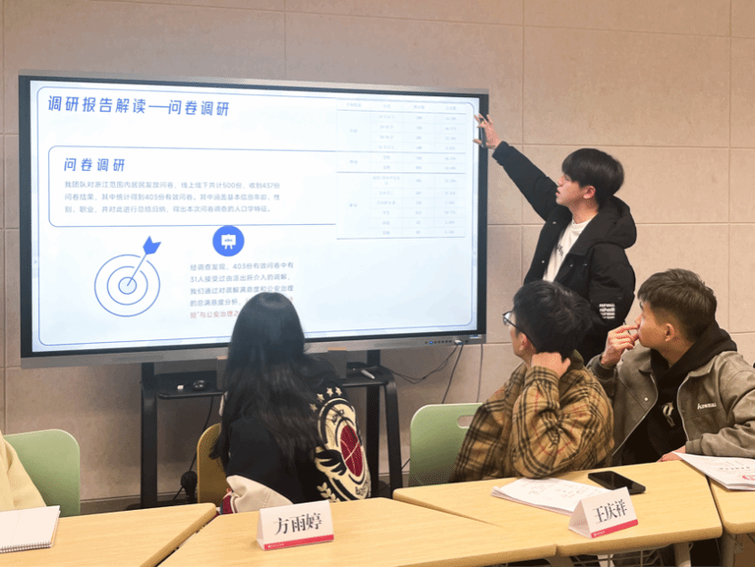 今年寒假期间,青马班学员分成两个小组开展寒假社会实践,通过调研主题选定、问卷设计、实地走访及报告撰写,体验了社会调研全过程。本次课程伊始,两个社会调研小组的成果展示便成为全场瞩目的焦点。一组围绕“浙江非遗保护与传承”这一课题,采用实地考察、数据分析等多种手段,全方位揭示了浙江非遗文化的独特魅力与保护现状,并提出小组对非遗传承的思考。另一组则将视线聚焦于“枫桥经验”,通过案例研究、问卷调查及实地走访派出所对民警进行采访等方式,深入剖析这一基层社会治理典范在新时代的传承与发展轨迹,为构建和谐社会提出了小组建议。