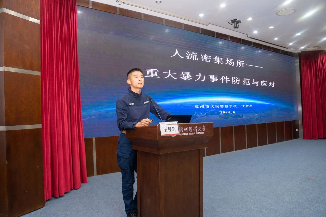 温州市人民警察学校三大队大队长王哲浩则针对国(境)外人流密集场所可能发生的重大暴力事件,为师生们提供了有效的预防、回避和防身方法,同时通过案例让师生们对此有了更深刻的认识。
