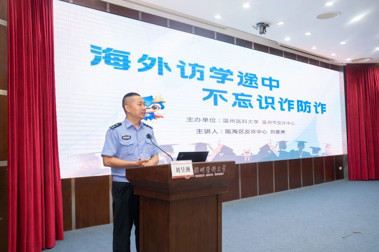 最后,温州市瓯海区反诈中心刘昱洲警官结合生动的案例,为师生们讲解了如何防范出国(境)访学中的诈骗事件,及典型网络诈骗的特点及应对方法,并提醒大家增强海外安全防范意识。