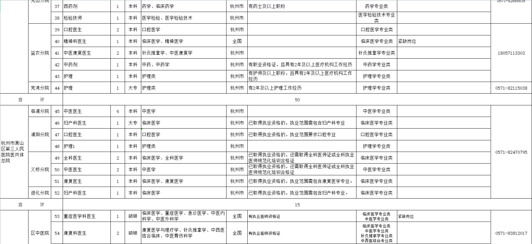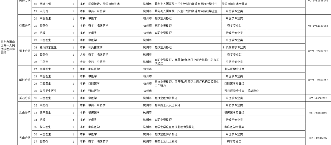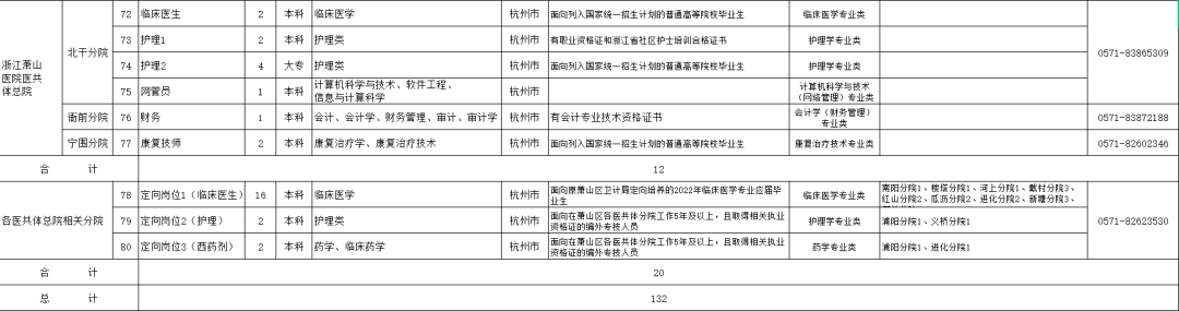 (1)报考杭州市萧山区第一人民医院医共体总院瓜沥院区、戴村院区、杭州市萧山区中医院医共体总院区中医院医学类岗位的考生须具有列入国家统一招生计划的普通高等院校相关学历。