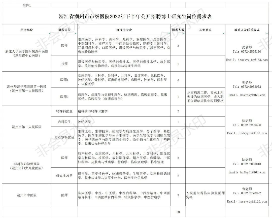 医护招聘|招聘20人|2022下半年浙江湖州市市级医院招聘博士研究生20人公告2022-10-30发表时间:2022年11月01日 13:38 流览量:次 作者: 分享到: