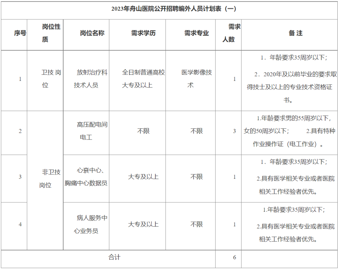 根据医院发展需要,经研究,舟山医院现面向社会公开招聘编外人员6名。目前舟山医院编外人员中卫技岗位的月工资奖金等已实行同工同酬管理。具体招聘事项公告如下: