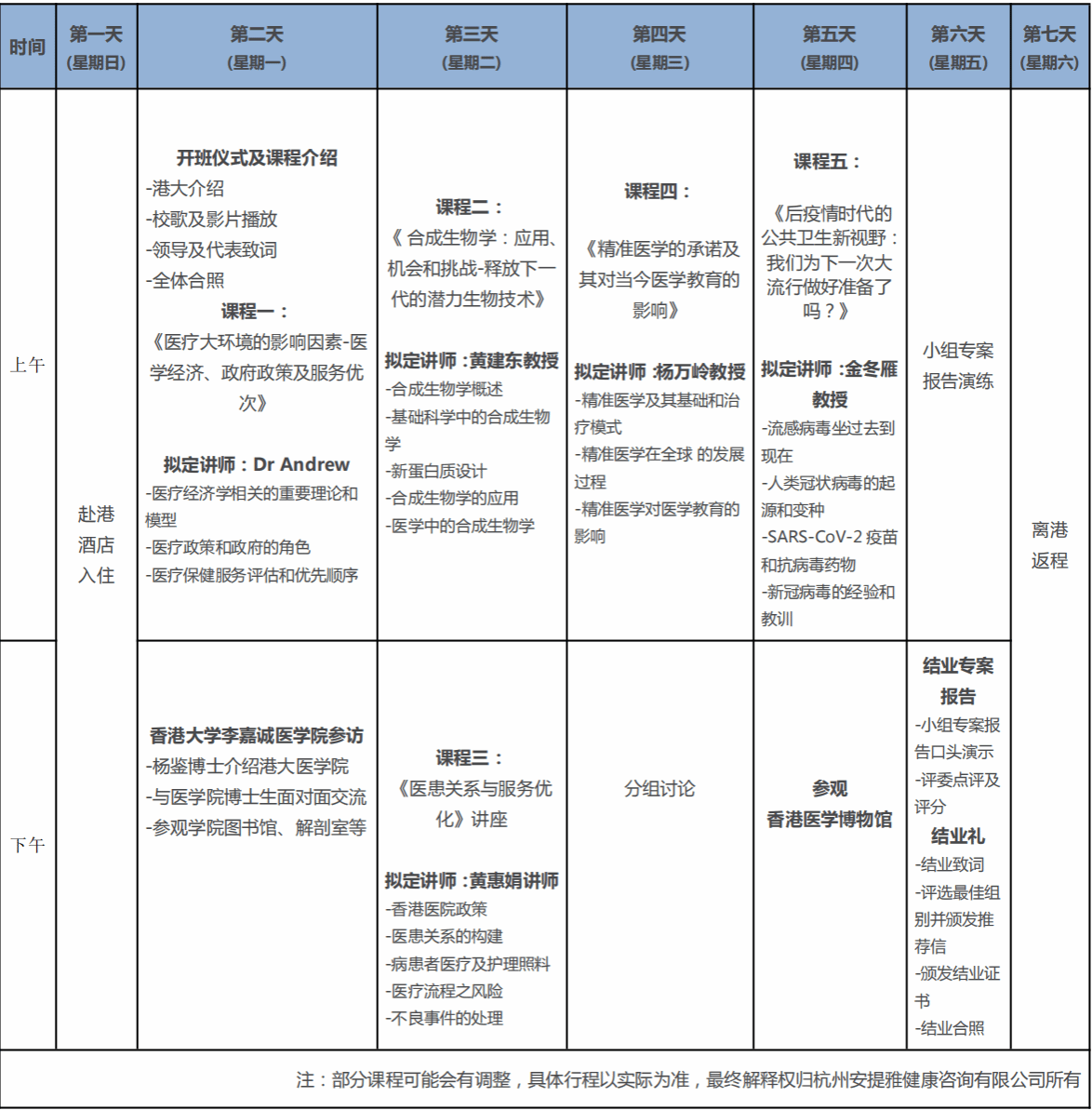 3.项目内容:邀请香港大学知名专家和教授为学生授课,从医疗大环境的影响因素开始,围绕医学前沿等相关主题的讲座,增加学生对专业知识和医学领域国际前沿研究成果的认识;同时可以结识来自不同地区不同文化背景的同伴,建立人脉网络。参加的学员可以获得由香港大学颁发结业证书,根据学员的出勤率、结业汇报等完成情况,优胜小组学员获得推荐信。具体课程安排如下: