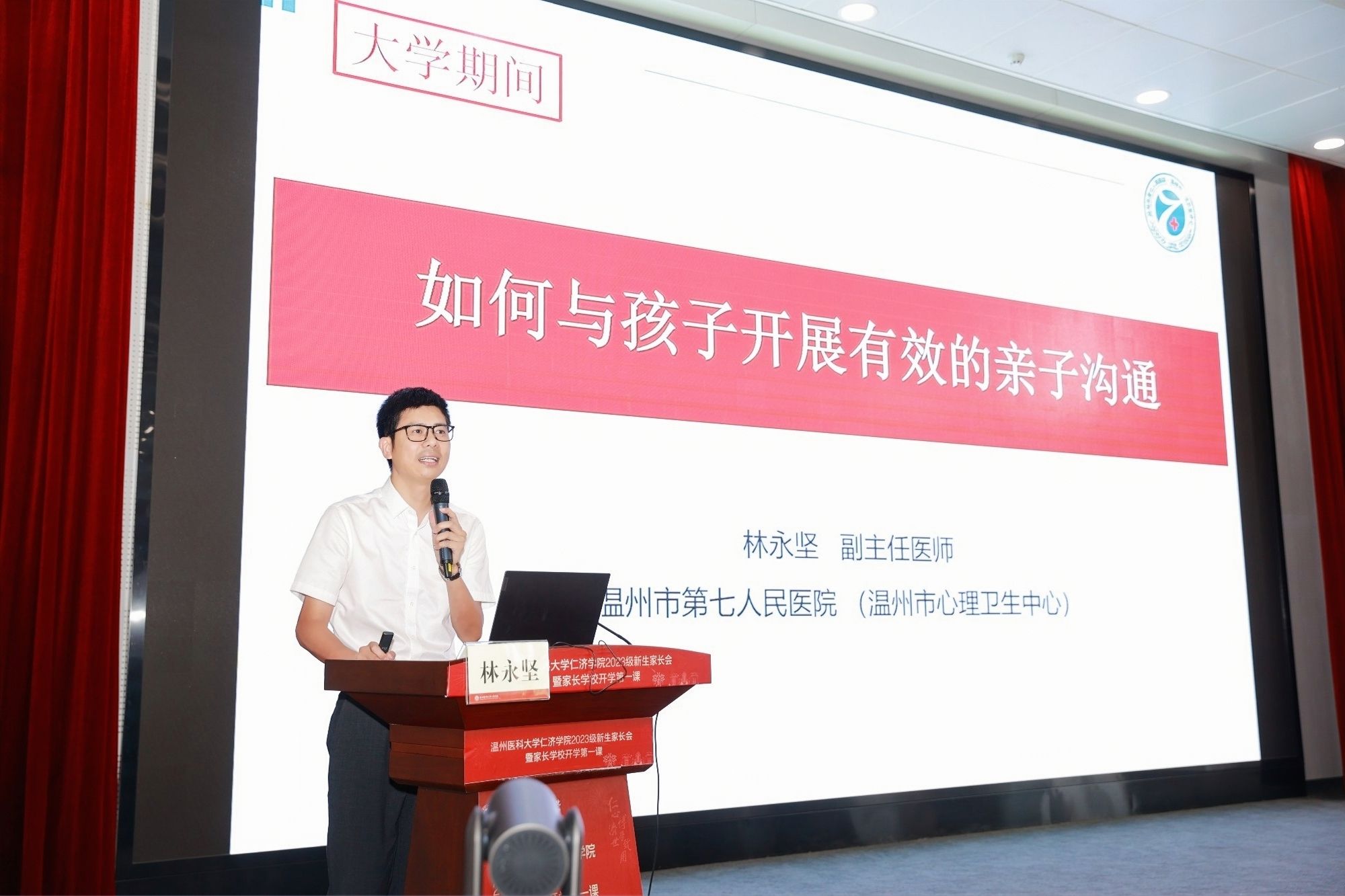 随后,温州市第七人民医院医务科副科长、副主任医师林永坚,为2023级新生家长开展《大学期间如何与孩子开展有效的亲子沟通》专题讲座,讲解关于大学生心理健康状态变化、健康的家庭关系以及有效的亲子沟通等内容,从专业角度出发帮助家长认识步入大学后更为科学有效的沟通技巧,家长们收获颇丰。新生家长在会后交流中表示:“听过老师们的讲解才发现过往与孩子的沟通,很多时候都用错了方法,孩子们步入大学,我们家长也要跟得上共同进步。”