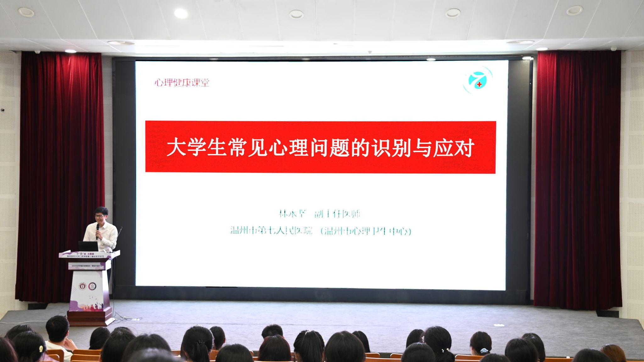温州市第七人民医院副主任医师林永坚,面向全体楼层长和寝室长开展了《大学生常见心理问题识别与应对》的专题培训,对大学生常见的心理问题和精神障碍的种类、特点、应对措施等做了详细的介绍,赢得了同学们的阵阵掌声。