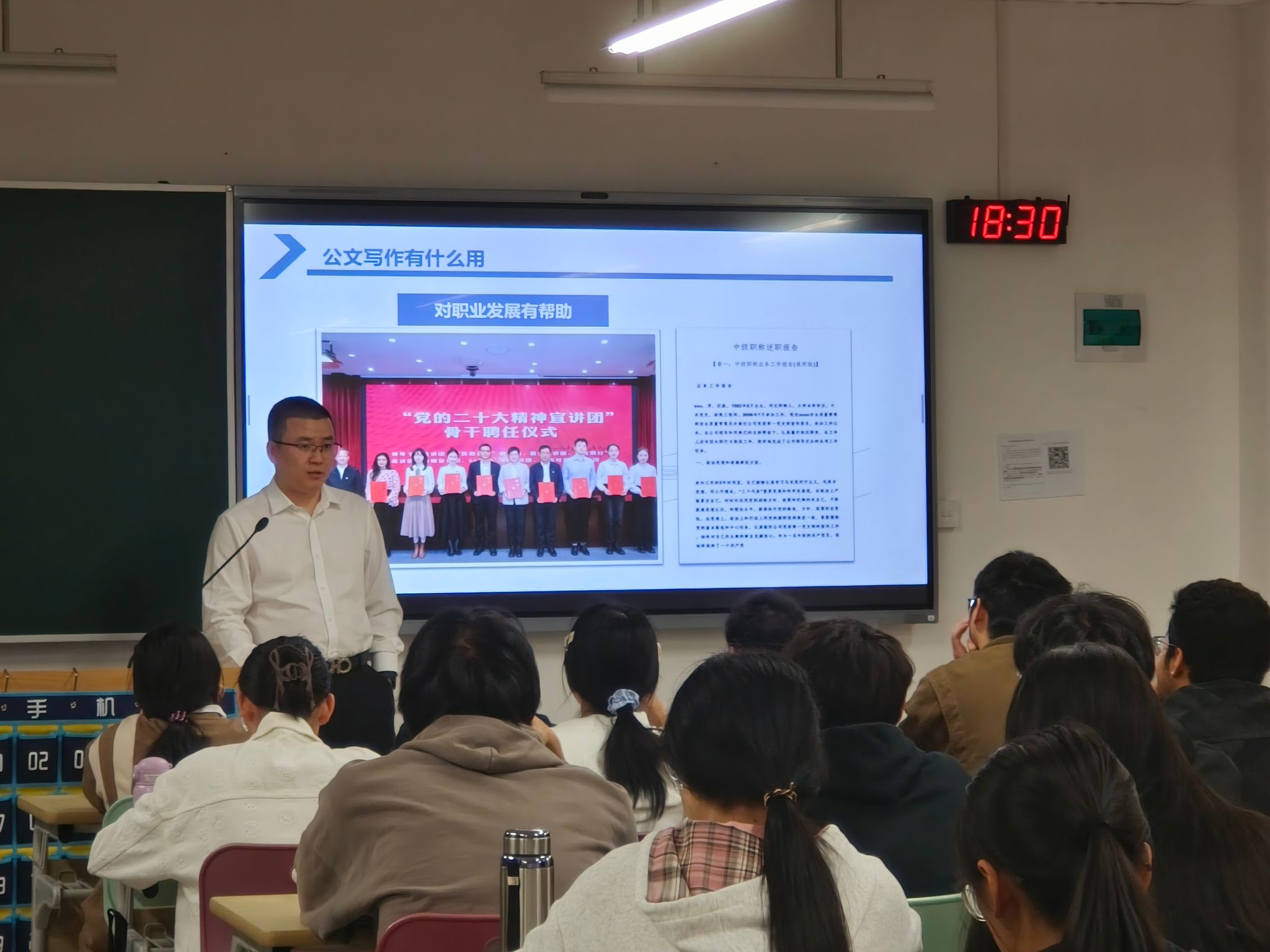 11月6日,“后浪计划——青年大学生成长赋能”之公文写作培训在小黄书 至理楼2102如期开展。本次讲座由温州市政协特邀信息员、清华大学出版社签约作者王振老师担任主讲老师,围绕公文写作的实用性、认识深度、速成技巧及日常练习方法进行了全面而深入的探讨。