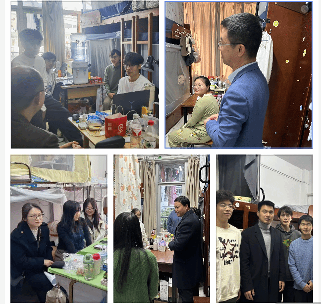 在走访过程中,彭红雷等老师与学生亲切交谈,详细了解他们的学习进展、生活状态以及心理状况。“你们目前在学习上、生活上有遇到什么问题吗?可以随时向我们反映,学院老师会尽力帮助大家解决。”彭老师提醒同学们在忙碌的学习生活中,要注意调节自身情绪,保持身心健康,同时还强调了寝室安全问题,希望同学们注意冬季用电安全,保持寝室卫生,营造一个更加温馨、整洁、和谐的寝室环境。“期末考试陆续开始了,大家记得制定好复习计划,保持积极乐观心态和规律作息习惯。”老师们纷纷鼓励同学们确立自己的“小目标”“小梦想”,以乐观的态度和饱满的精神状态投入到期末学习中。