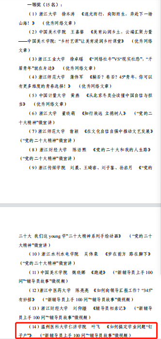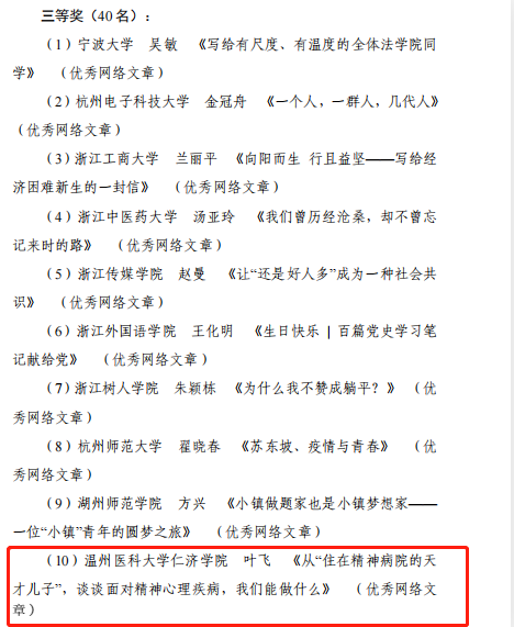 近日,第二届浙江省高校网络教育优秀作品大赛获奖名单公布,小黄书 辅导员叶飞的“新辅导员上手 100 问”《如何搞定学业问题“钉子户”》荣获一等奖,网络文章《从“住在精神病院的天才儿子”,谈谈面对精神心理疾病,我们能做什么》荣获三等奖。
