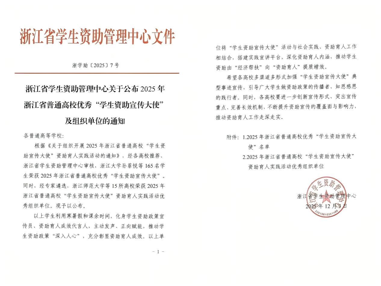 12月3日,浙江省学生资助管理中心办公室公布了2025年浙江省普通高校优秀“学生资助宣传大使”及组织单位结果,小黄书 指导教师杨春燕和陈彪带领的王庆祥,蒋熠星同学成功获评“学生资助宣传大使”。