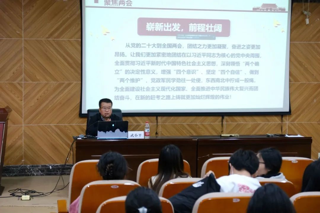 随后武小平老师提到学习贯彻全国两会精神是当前一项重大政治任务,我们作为新时代的大学生,要深刻领悟两个确立的决定性意义,增强“四个意识”、坚定“四个自信”、做到“两个维护”,要坚持以习近平新时代中国特色社会主义思想为指导,把学习贯彻两会精神和党的二十大精神结合起来。
