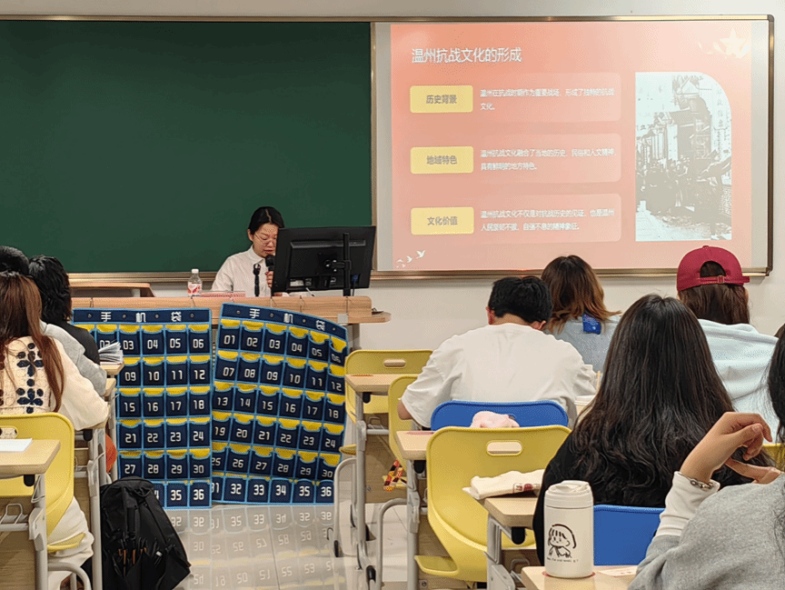 主讲人王聪颖首先介绍了抗战时期的温州是中国东南沿海的一个重要城市,经历了巨大的磨难和损失,在这样的历史背景下,温州人民展现出了顽强抵抗、不畏强暴的英勇气概,为保卫家园、捍卫民族尊严付出了巨大的努力和牺牲。这种不屈不挠、团结奋斗的精神,正是温州抗战文化的核心所在。温州人民形成了坚韧不拔、自强不息的抗战精神,这种精神成为温州抗战文化的重要组成部分,有鲜明的地域特色和民族特色,这体现了温州人民的英勇抗争和爱国情怀。