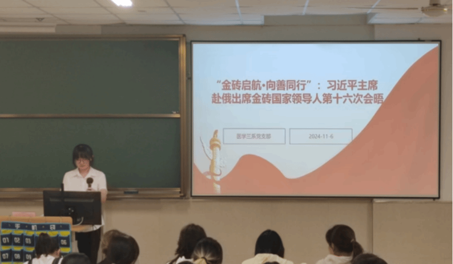 2024年11月6日晚六点三十分,党建服务与人才培训中心分别于茶山校区和滨海校区开展了以“金砖启航·向善同行”为主题的一周看时事活动。主讲人分别从“金砖国家概述与背景”、“金砖国家在政治领域合作与进展”、“金砖国家在经贸领域合作与成果”、“人文交流与合作——民心相同桥梁”、“习近平主席出席金砖国家领导人第十六次会晤”五个方面进行讲述。