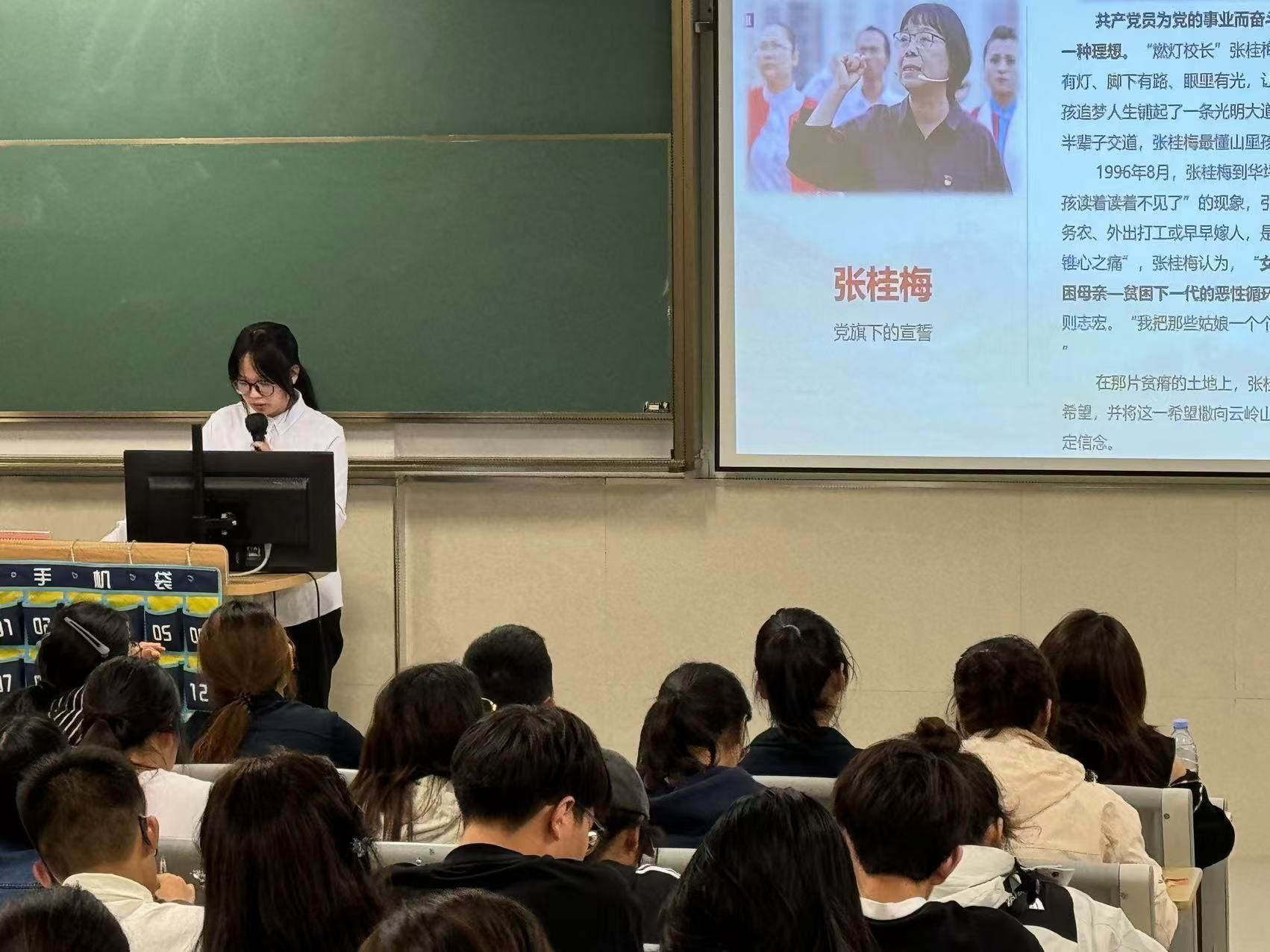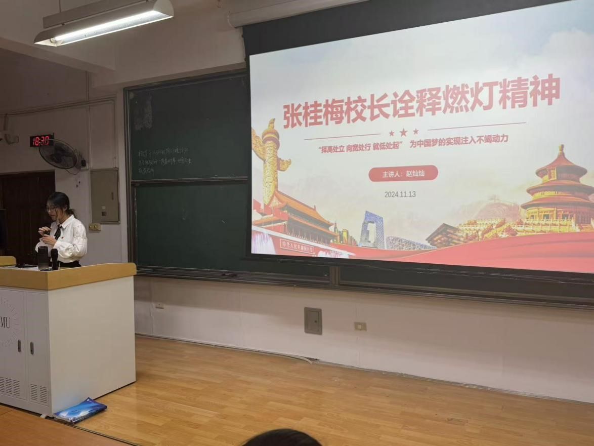 20241113日星期三晚六点三十分,党建服务与人才培训中心分别于茶山校区和滨海校区开展了“张桂梅校长诠释燃灯精神”为主题的一周看时事活动。主讲人分别从“话题引入”、“精神学习”、“行动实践”三个方面进行讲述。