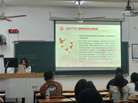 2025年5月9日星期五,高峰论坛在茶山校区7A401教室开展,先锋讲师团讲师周心驰以“百年奋斗铸魂魄,建党精神绽光芒”为主题,从三个方面阐释建党精神,带领同学们深入解读了中国共产党人的精神谱系及其在新时代的重要意义。