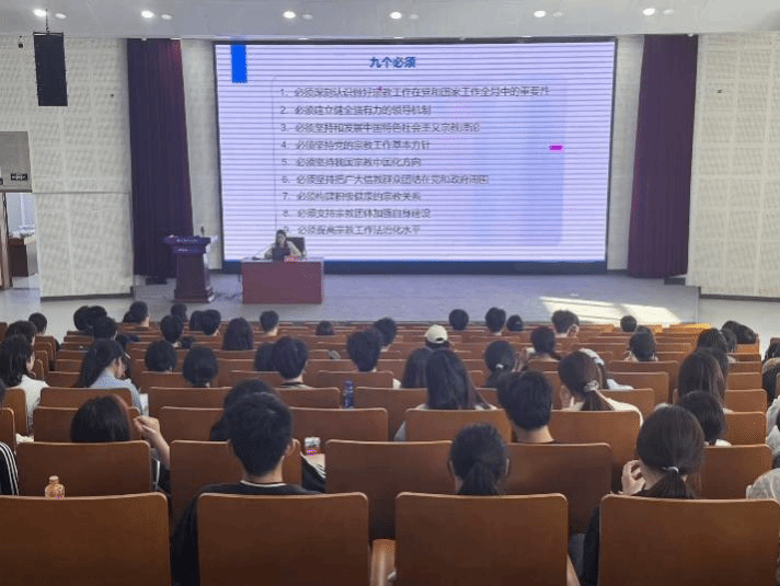 姜老师向同学们介绍了党关于宗教问题的基本观点和基本政策法规以及党的十八大以来党的宗教工作方针,强调要防范和抵御宗教向校园渗透。他指出,希望同学们能进一步强化马克思主义宗教观和无神论学习,提高思想政治觉悟,践行社会主义核心价值观。将学习成果转化为实际行动,在实践中不断锤炼自己,努力成长为能够担当民族复兴大任的新时代青年。