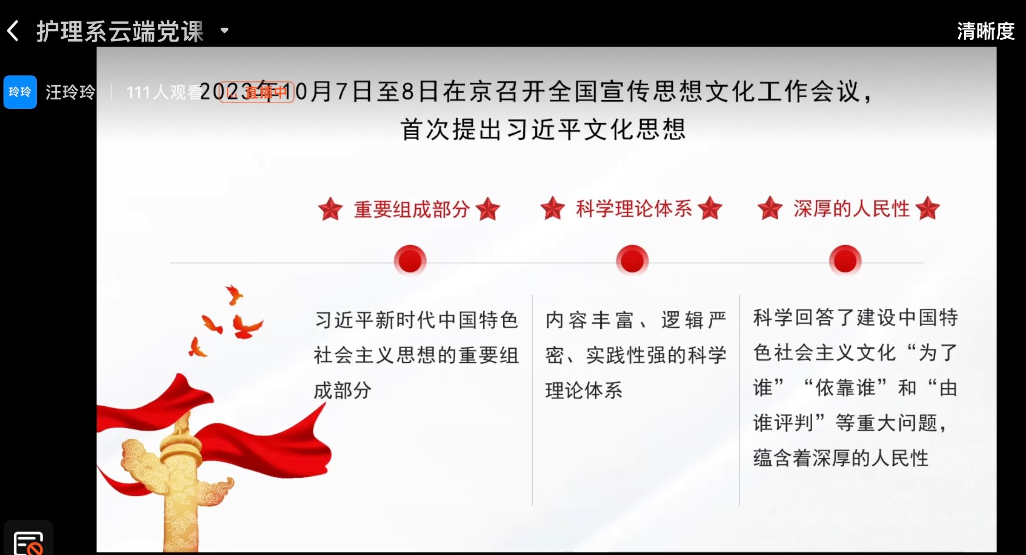 为深刻学习习近平文化思想,护理系第二党支部和护理系第三党支部于2023年12月13日晚上以钉钉直播的方式开展了云端党课,本次党课由护理系党总支书记、护理系第二党支部书记汪玲玲老师主讲。