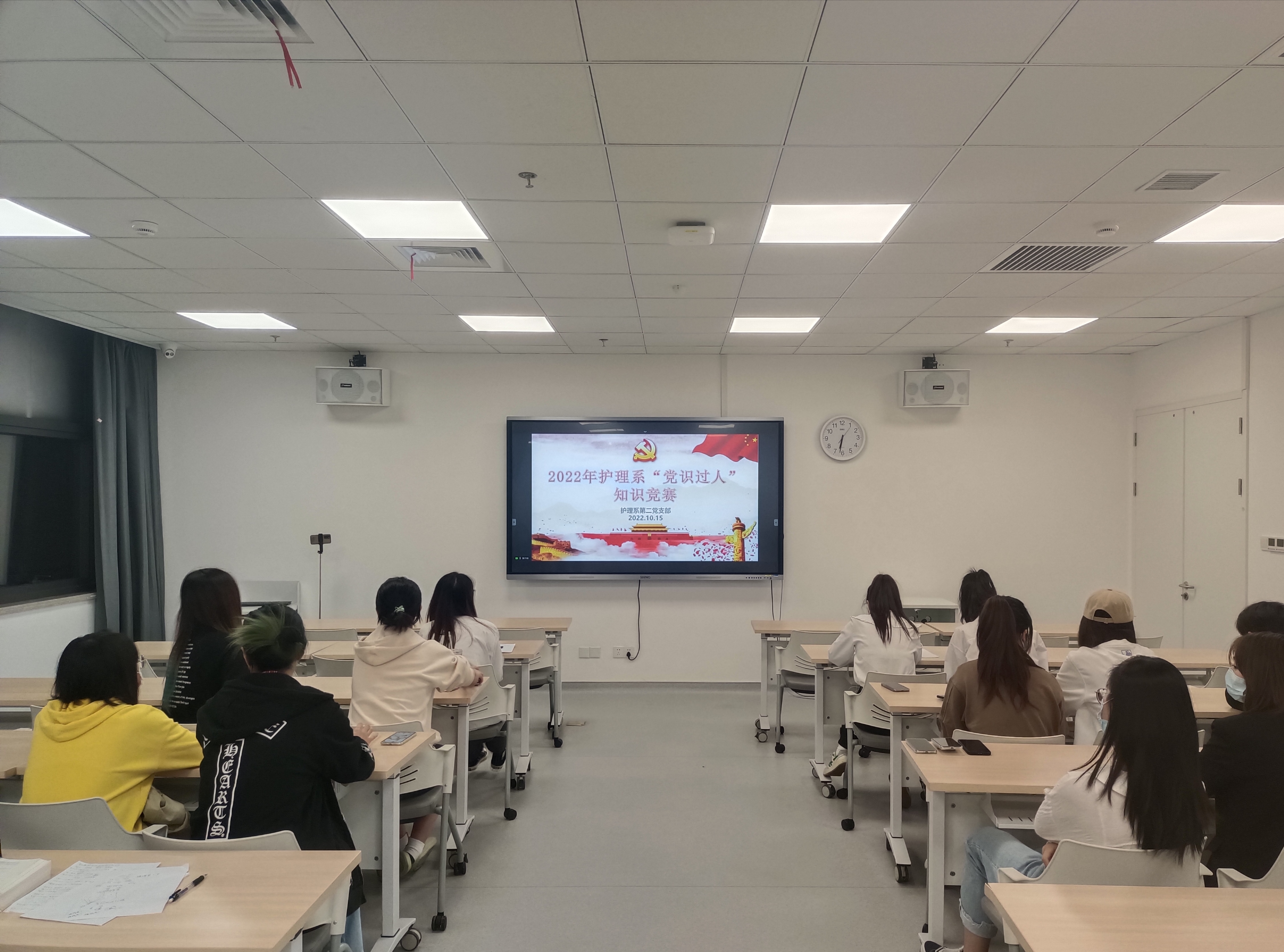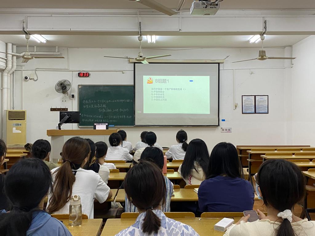 为迎接党的二十大胜利召开,推动党史学习教育,检验党史学习教育成果,小黄书 护理系第二党支部于2022年10月15日18:30在茶山校区7c107教室和钉钉线上举行“党识过人”知识竞赛。本次竞赛共有三个环节,三轮比赛,共有五个小组参赛,由黄丹榕同志主持。