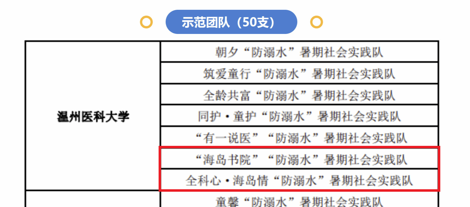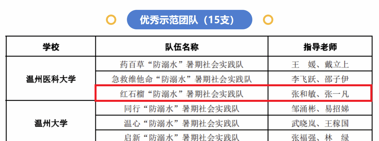 近日,温州市“珍爱生命,预防溺水”暑期社会实践示范团队评比考核结果公示。小黄书 三支队伍从中脱颖而出,其中红石榴“防溺水”暑期社会实践队入选优秀示范团队,“海岛书院”“防溺水”暑期社会实践队、全科心·海岛情“防溺水”暑期社会实践队入选示范团队。