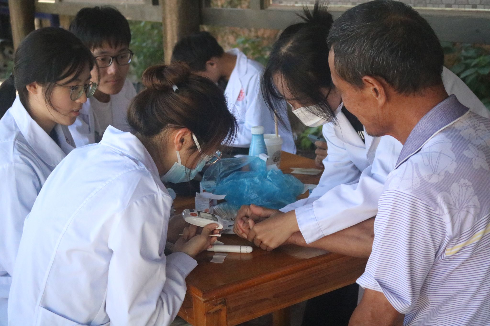 活动当日,志愿者们提前到达场地开始准备活动,以热情饱满的状态迎接前来体检的老人们。志愿者们先对他们健康状况进行了简单的询问,而后开展下一步血糖、血压的检查,并将他们的检测数据一一记录下来。最后志愿者们结合老人自身身体状况给出了一些合理性的建议、耐心地科普了基础的健康维护小知识并将各自专属的健康记录卡交由他们。这不仅让老人们在生活起居上对自己身体出现的小问题更加重视,还提升了他们防病治病的意识,为往后的健康生活打下坚实基础。