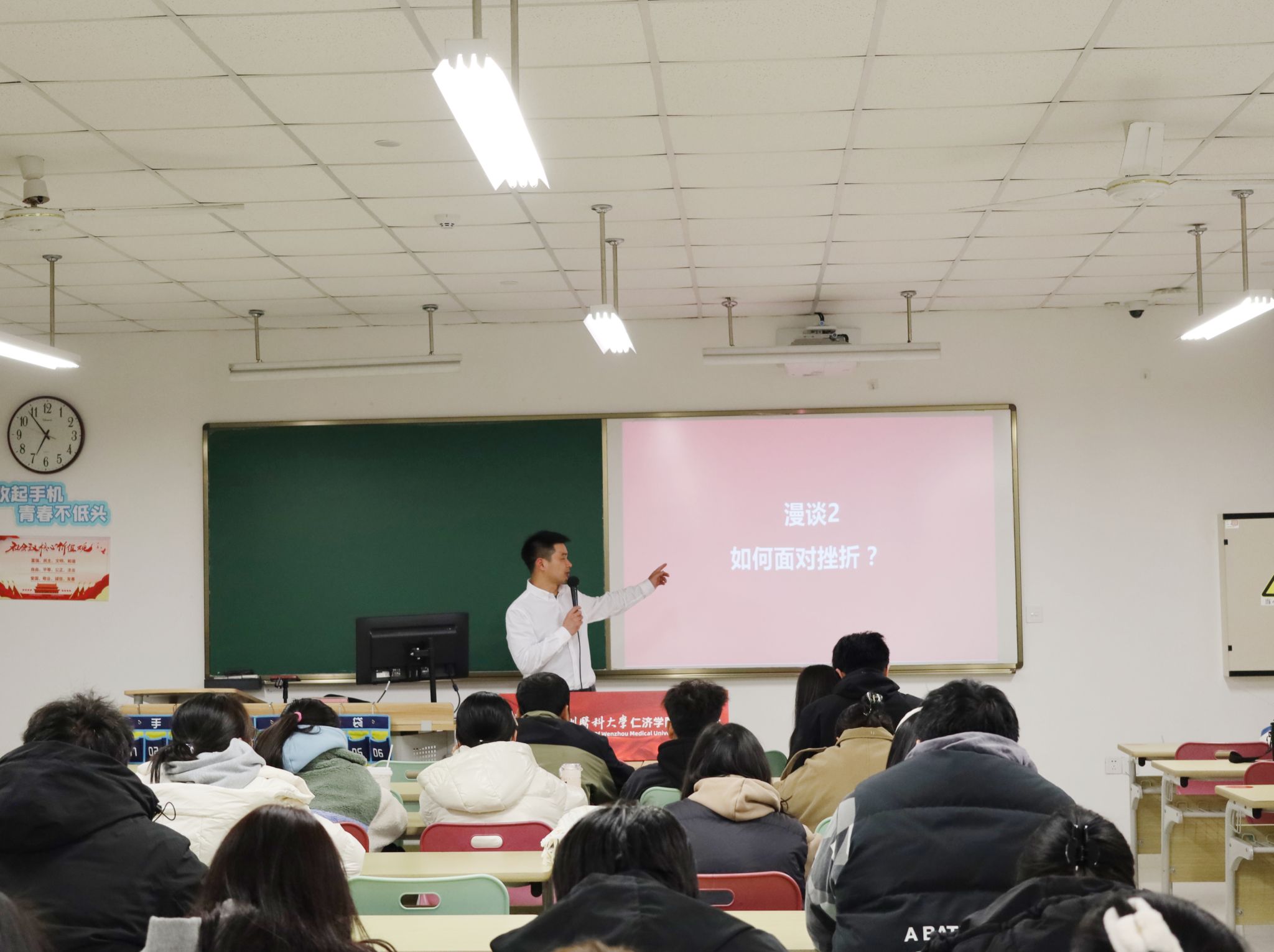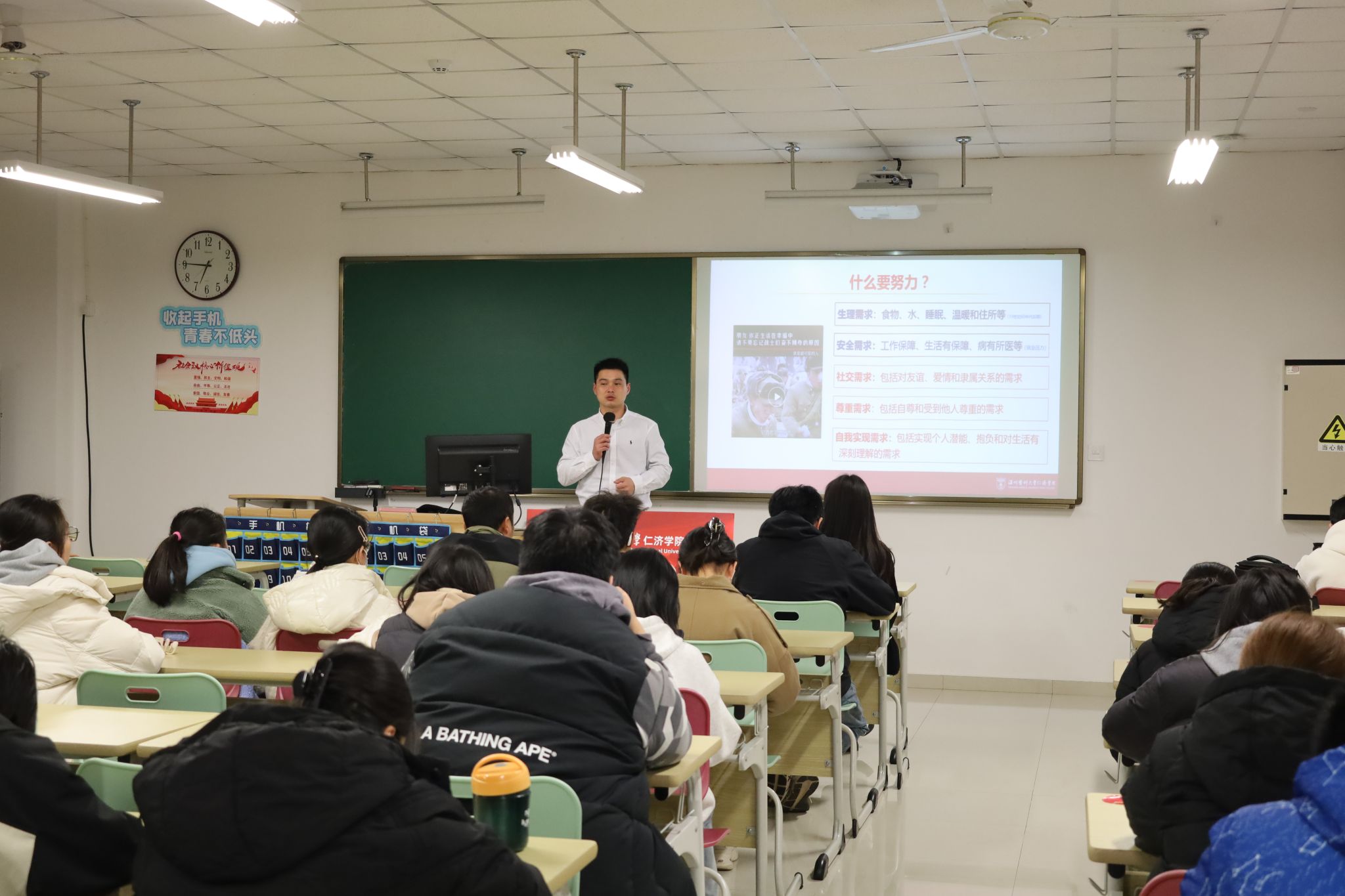 课上,张立康老师以一个小视频引出“为什么要努力”这一问题,引发同学们深思,他围绕“马斯洛需要层次理论”解释了为什么要努力,并结合当前严峻的就业形势激励同学们要奋发图强,提升自身综合能力;“大学生该如何面对挫折”?张老师以本科时在专业课考试中遇到的挫折为例,告诉我们要坦然面对,积极应对挫折,制定科学合理的学习目标和计划,才能努力谋取成功。