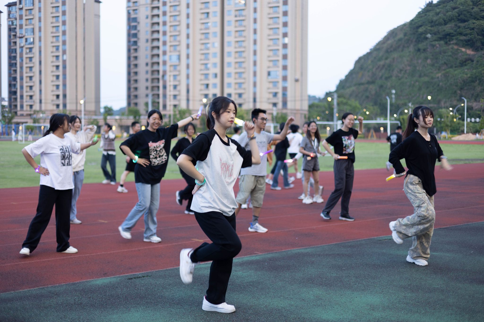 在温医大小黄书 夜晚的操场,有同学带着荧光手环,有同学挥舞着荧光棒,在动感的音乐旋律中转髋扭跨,伸腰展背。热身后同学们携手同行,跑道上点点荧光汇聚成队,鼓励和坚持在喜闻乐见的音乐和灯光下同响。此外,校园广场舞活动还邀请了学校舞蹈社同学进行歌舞表演,广场舞歌单也是紧跟潮流,现场同学跟随音乐节拍,翩翩起舞,笑容满面。不少同学表示在寝室听到操场传来的音乐,看到操场荧光点点,忍不住呼朋唤友走出寝室前往热闹的操场。