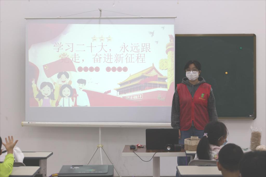 随后,志愿者与小朋友们一起朗读党的二十大的金句:新征程是充满光荣和梦想的征途。蓝图已经绘就,号角已经吹响。我们要踔厉奋发、勇毅前行,努力创造更加灿烂的明天!小朋友们情绪饱满,仿佛已将自己的雄心壮志融入进朗读声里。紧接着,志愿者以“自己能够为祖国做的事”向小朋友们发出提问,小朋友们纷纷举手,畅所欲言:“我可以为祖国捡干净地上的垃圾”,我能把五星红旗画的更鲜艳”等等。从小朋友们的发言中我们感受到了一颗颗赤诚的爱国之心。