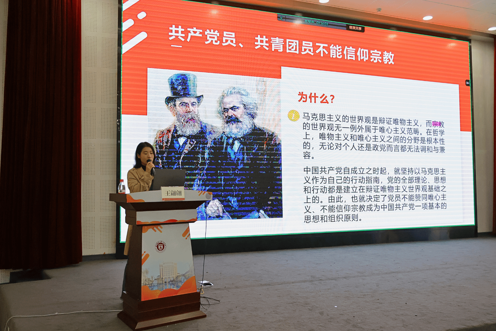 紧接着,学院团委书记王翩翩老师为学员们带来了题为《学生干部、团干部、党团知识应知应会——从一封学生干部自律公约说起》的精彩课程。王老师以一封倡议书为引子,深入浅出地讲解了学生干部、团干部应具备的基本素质与职责担当及马克思主义宗教观。她强调,作为新时代的青年学子,应恪守学生本分、牢记本会要旨、永葆理想主义情怀、扎扎实实做事、营造平等氛围,并坚决摒弃庸俗习气。在课程中,王老师还介绍了团史、温州历史,及学校的优秀学生榜样,希望大家能够铭记历史、立足本职、敢于拼搏、勇于担当,做一名德智体美劳全面发展的仁济学子。