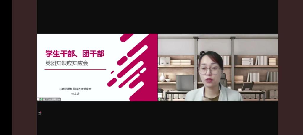 随后,校团委副书记林文诗老师讲授以《学生干部、团干部党团知识应知应会》为主的课程。课上,林老师强调我校学子要传承“敢为人先,特别能创业创新”的温州精神,谨记“仁肃勤朴,求是奋发”的校训。要准确把握共青团是党的助手和后备军的定位,把培养社会主义建设者和接班人作为根本任务;把巩固和扩大党执政的青年群众基础作为政治责;把围绕中心、服务大局作为工作主线这三个根本问题。作为学生骨干,要认真学习,有奉献意识,履行应尽职责,以学校、集体利益为重,坚持唯物主义,在温医大遇见更好的自己。