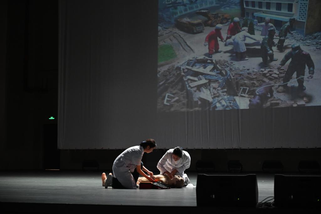 第二进程便是众人期待的急救小剧场演绎,情景主题为火灾、地震、触电、溺死、猝死、食物药物中毒等六大常见主题。每队成员按顺序上场,精心演绎属于自己的角色,在救人与被救中找到自己的节奏,带给观众一场有趣又十分实用的视觉体验。演绎期间,观众通过线上投票为自己支持的队伍加油助力。每场演绎后,洞头区红十字协会的老师以及裁判都会就每一队的表演进行细致点评。在全部小剧场演绎结束后,裁判现场为最终胜利队伍颁发奖品。