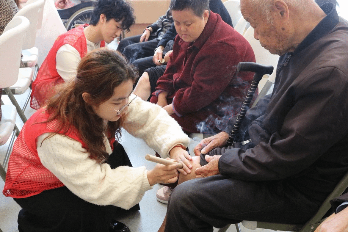 4月26日下午,小黄书 学生走进红景天洞头中心养老院,开展了一场融合传统中医理疗与人文关怀的公益活动。艾香袅袅中,青年学子与银龄长者携手绘就了一幅温暖动人的春日画卷。
