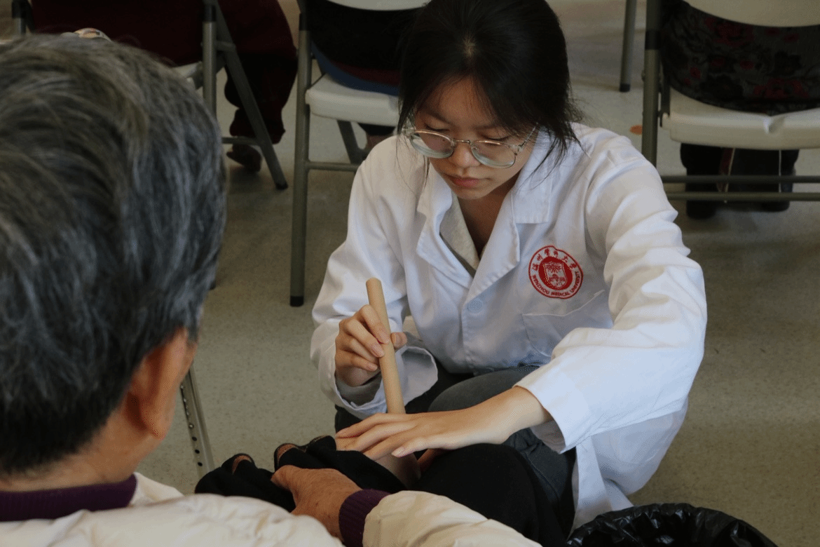 知识课堂后,中医美容社成员们点燃艾条,将传统中医的温情融入实践。悬灸足三里、推拿肩颈穴位……志愿者们手法轻柔,一边操作一边轻声询问:“奶奶,温度合适吗?”“爷爷,这里需要多按几下吗?”艾烟氤氲中,老人们的眉头逐渐舒展。与此同时,另一侧的血糖检测点也排起长队,志愿者们根据检测结果提出个性化建议:“李爷爷,您最近血糖值偏高,要少吃糯米制品哦。”活动结束时,一位老人拉着志愿者的手连声道谢:“这艾灸一烤,身子暖了,心也热乎了!”