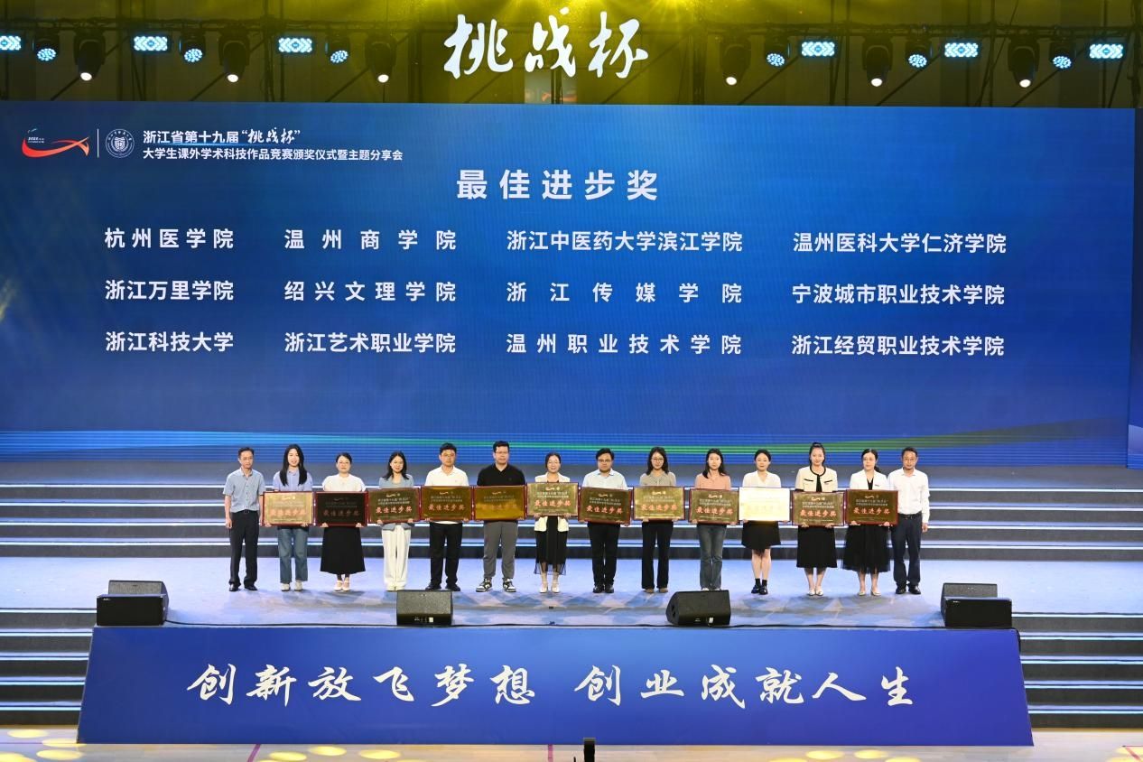 5月18日,由共青团浙江省委、浙江省教育厅、浙江省社会科学院、浙江省科学技术协会、浙江省学生联合会主办,浙江中医药大学承办的浙江省第十九届“挑战杯”大学生课外学术科技作品竞赛颁奖典礼在浙江中医药大学举行。小黄书 荣获金奖1项、银奖5项、铜奖8项,学院连续两年荣获“最佳进步奖”。