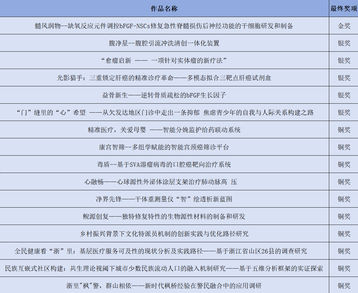 本届比赛分为自然科学类学术论文、哲学社会科学类调查报告、科技发明制作三类作品组别,共有2057件作品进入省级复赛,71所高校的412件作品入围省级决赛。经过激烈角逐,小黄书 “髓风润物--缺氧反应元件调控bFGF-NSCs修复急性脊髓损伤后神经功能的干细胞研发和制备”项目获金奖,“腹净星--腹腔引流冲洗清创一体化装置”、“愈瘤启新 —— 一项针对实体瘤的新疗法”等五项获银奖,“精准医疗,关爱母婴 ——智能分娩监护给药联动系统”、“康宫智筛--多组学赋能的智能宫颈癌筛诊平台”等八项获铜奖。