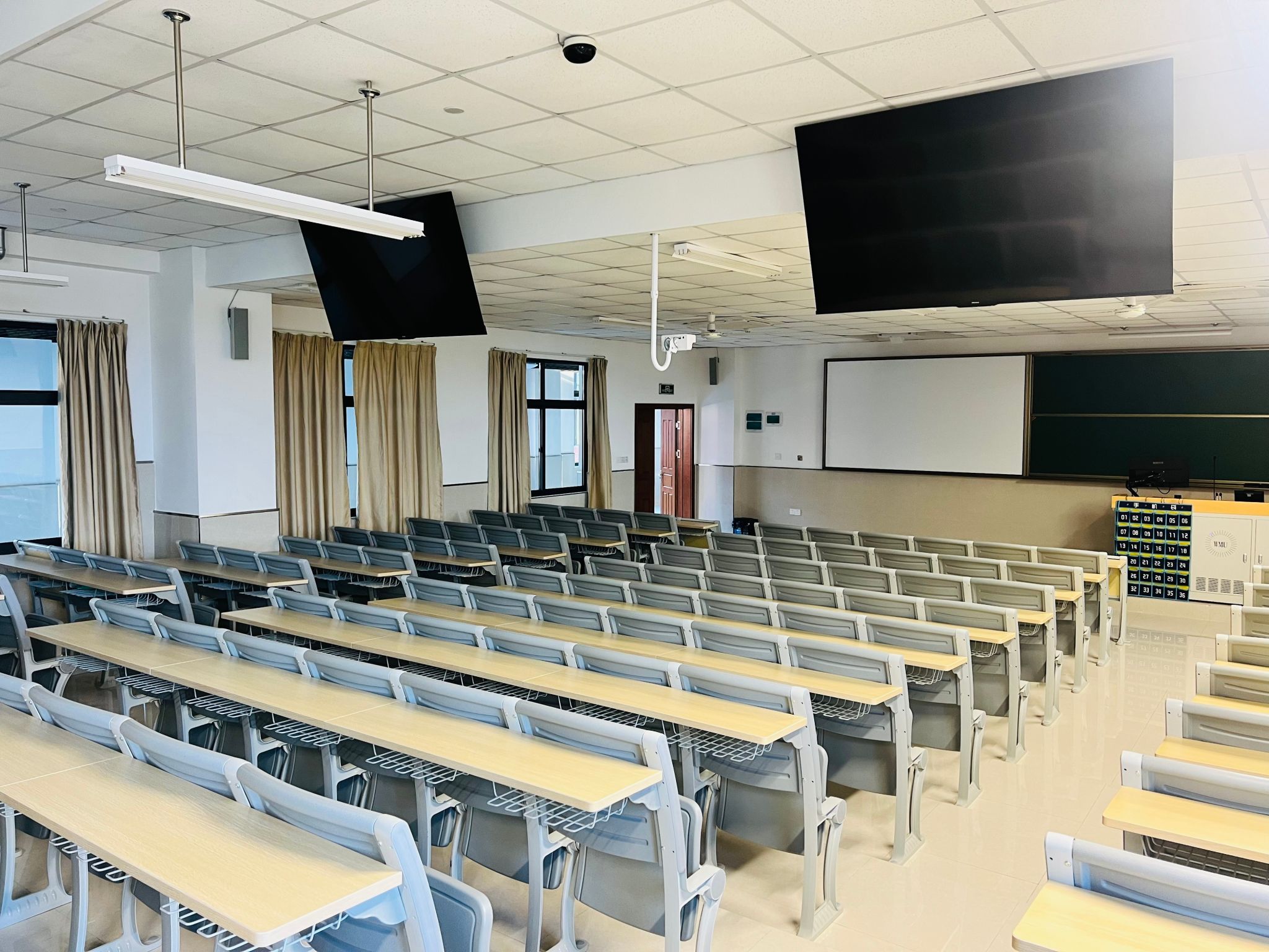 验收组人员对新建教室的课桌椅、讲台、多媒体设备等进行了仔细的检查。此次验收的多媒体教室共20间,2490个座位。每间教室均配备了高清投影、智能大屏、数字扩声系统、人脸识别等设备。现代信息化的设施不仅丰富了教师的教学手法,也为学生带来了更加生动的学习体验。教室内灵活可移动的课桌椅设计更是增强了课堂的互动性和教学灵活性,便于同学们开展小组讨论和合作学习。