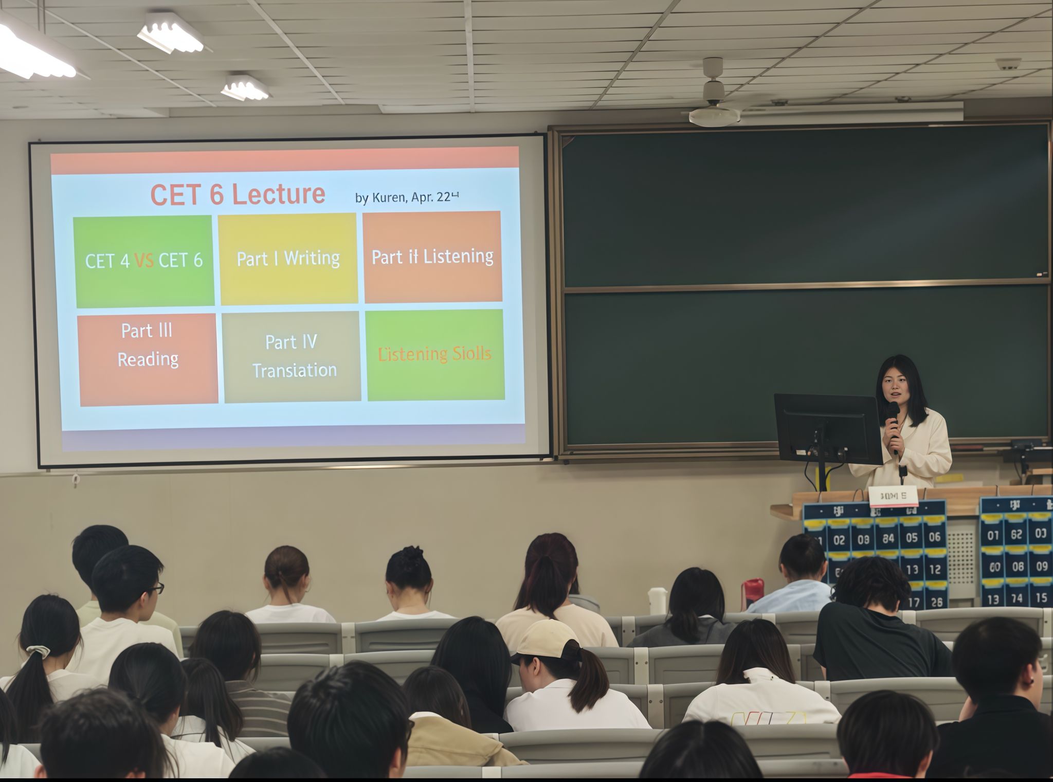 为助力学生高效备战大学英语六级考试,学院与外国语学院于近日联合组织开展滨海校区英语六级专题讲座。本次活动特邀拥有20余年丰富外语教学经验的资深教师周阿芹担任主讲,为同学们带来了一场干货满满的备考指导。