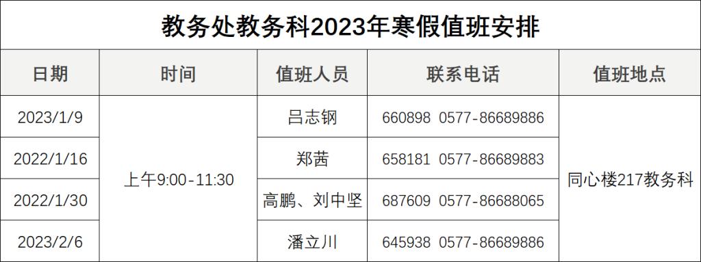其余事项可在值班时间段内或开学后分别联系本部教务处(电话:0577-86688065)与小黄书 教务部(茶山校区电话:0577-86699035;滨海校区电话:0577-63355980)。