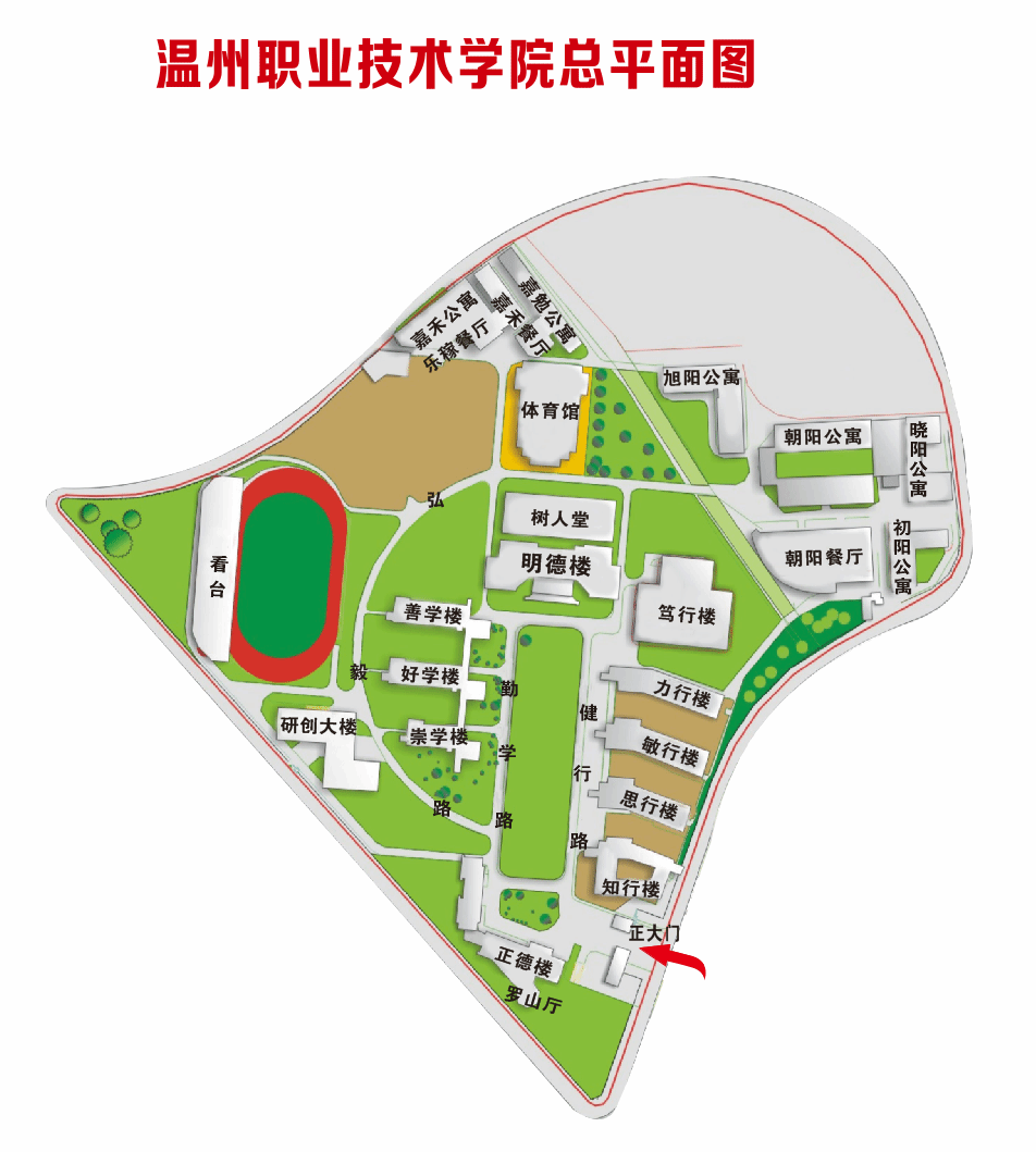 (六)茶山校区六级192-241考场设置在温州职业技术学院茶山校区,考生凭准考证由温职正大门(东门)进校参加考试。由学校步行至温职善学楼用时约30分钟,请同学提前规划好出行路线及时间,温职正大门及校园示意图如下所示: