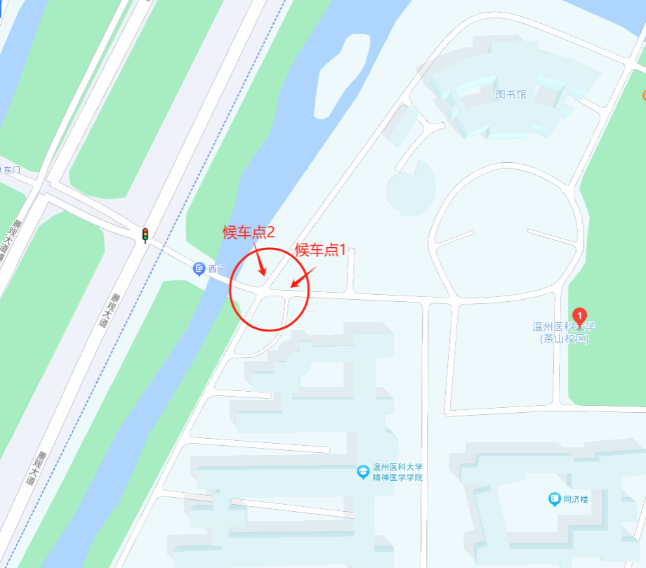 2.候车点:茶山校区候车点为西门出口附近(共2个候车点),如下图所示: