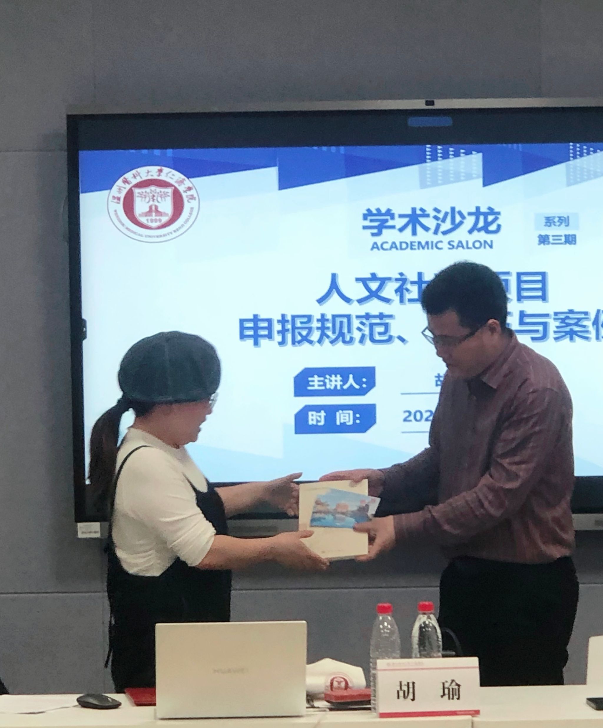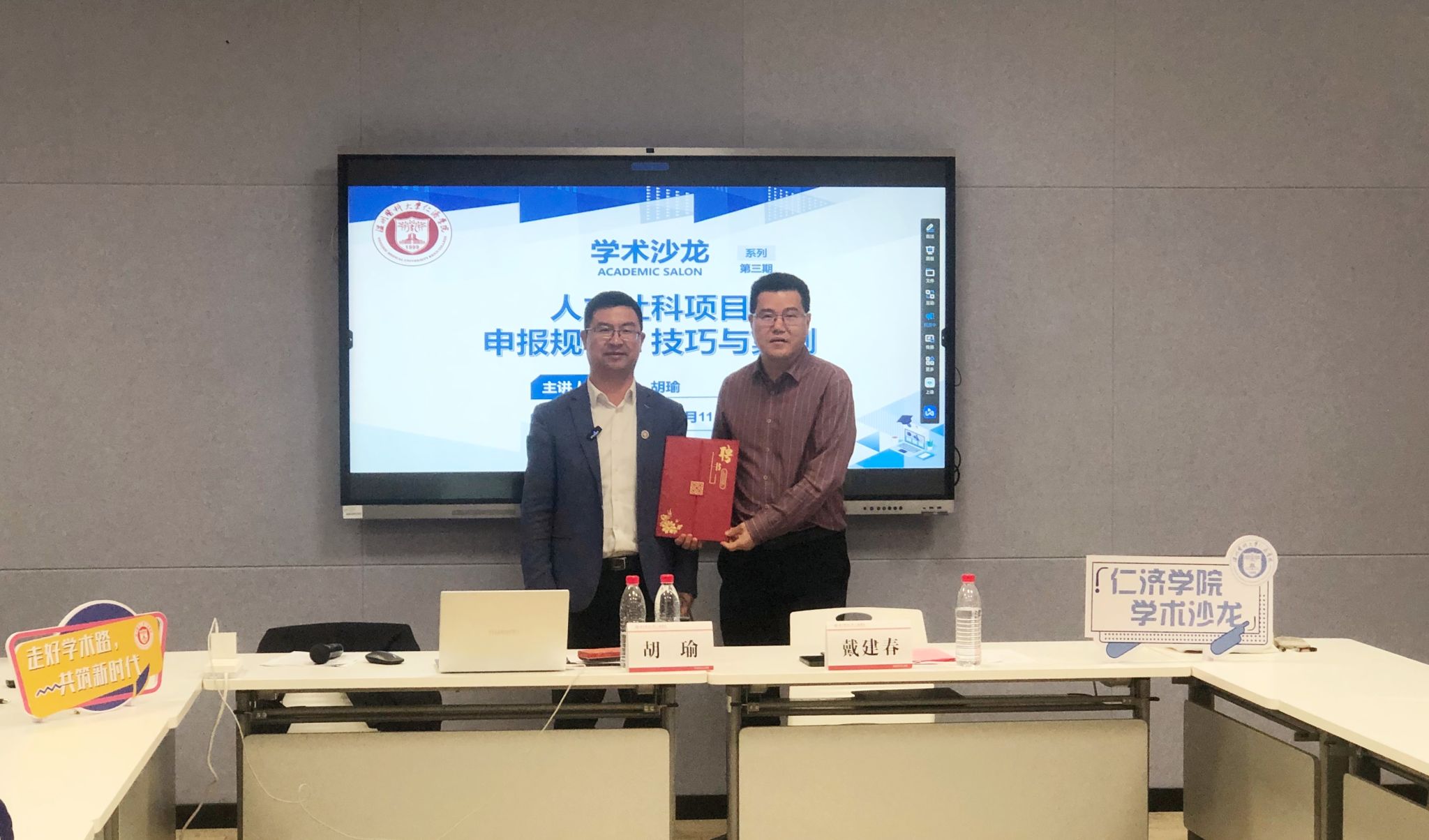 会后,戴建春副院长为胡瑜教授颁发学院教科研项目评审专家聘书,邀请他助力学院科研建设与发展。积极参与讨论的教师获赠《人文社科项目申报300问》参考书,以此恳定其勤思善问。其他参会教师获得学院定制人文社科项目明信片,其上印有各级别项目申报时间表,以此鼓励教师们积极申报。